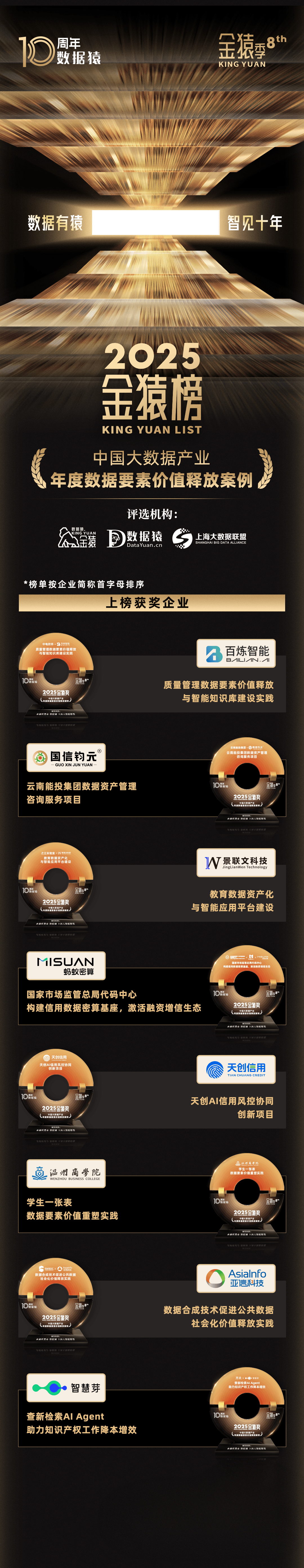 本次上榜的十年前锋人物、十年标杆产物、CIO、数据要素、AI Infra、立异手艺、Data Agent、国产化类别榜单/项申报方,均正在第八届金猿颁仪式现场获颁荣誉杯(手艺项还获颁一份手艺团队荣誉证书)予以激励,并正在数据猿20+国内播发布渠道,以及100+外部合做同步全网,面向包罗金融、工业、医疗、消费、政务等正在内的全行业,展现大数据取人工智能、云计较、物联网等新手艺融合下的落地使用取成长潜力。