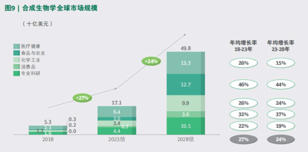 全球合成生物学财产过去五年履历了高速增加,市场规模从2018年的53亿美元增加到2023年的跨越170亿美元,平均年增加率达27%。估计全球合成生物市场正在可见的将来仍将连结较快成长势头。